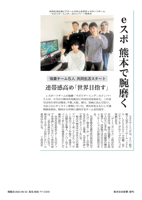 熊本を拠点にEスポーツチームとして活動を行っている内容をゲーミングハウス(活動拠点)までお越しいただいて取材が行われました。